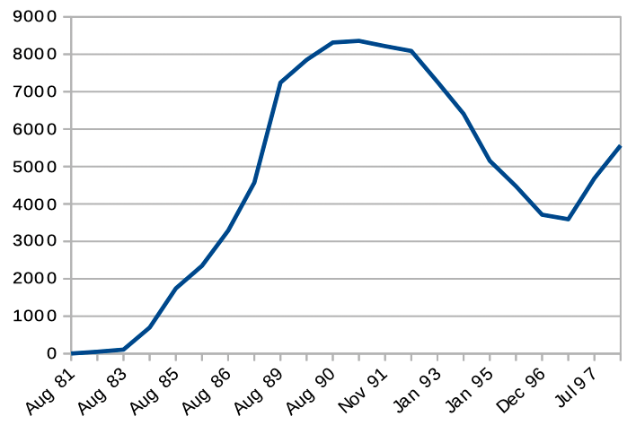 The following graph uses date collected by the VNS publishing system and shows the growth, decline and resurgence of the email readership between the first issue in August 1981 and the end of 1997. Digital Equipment Corporation was sold to Compaq in 1998.